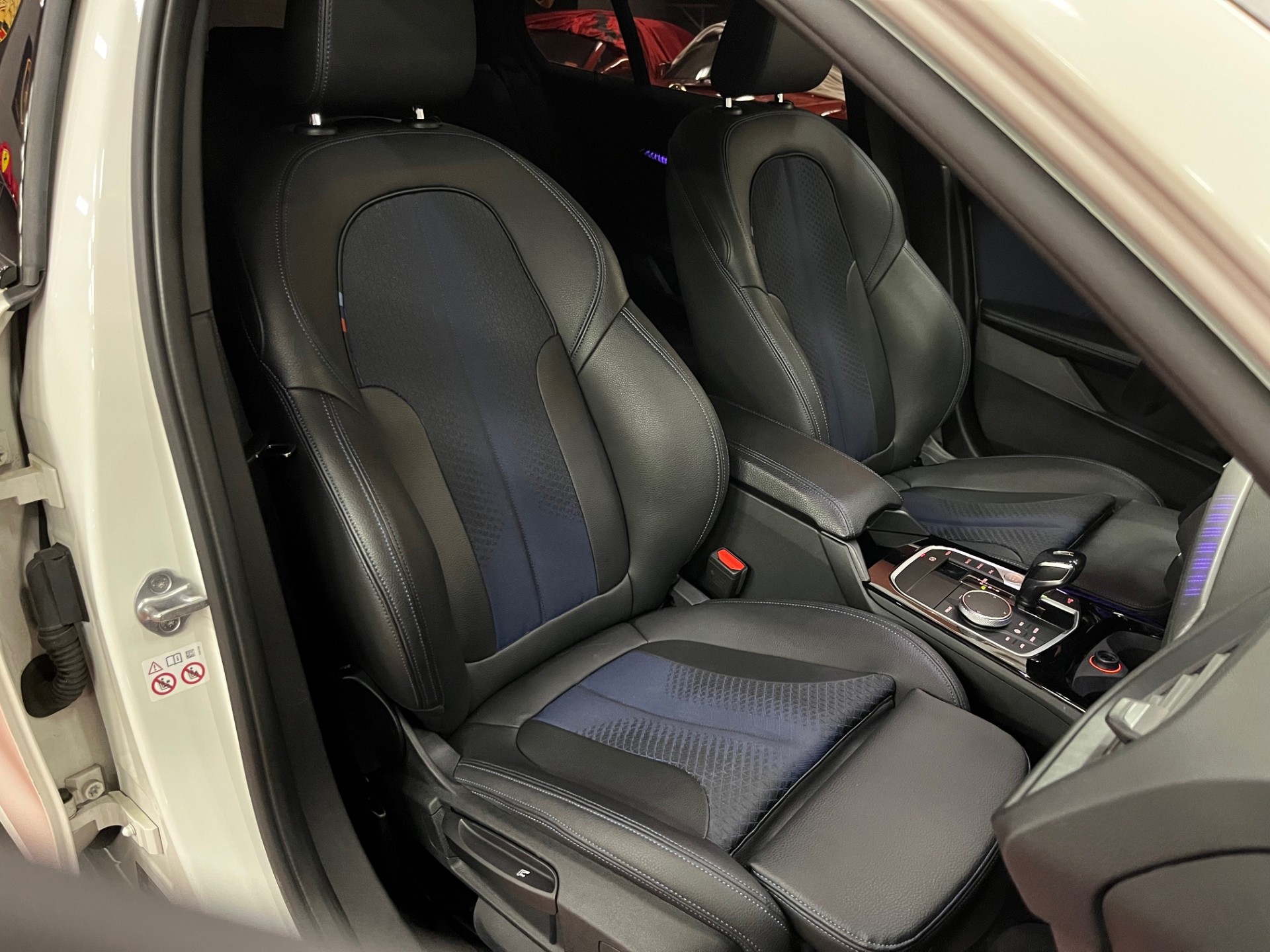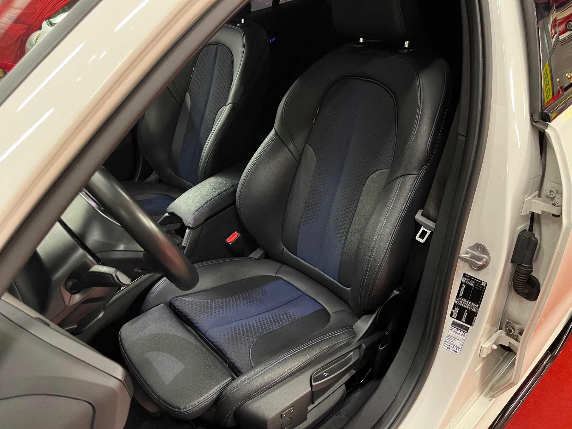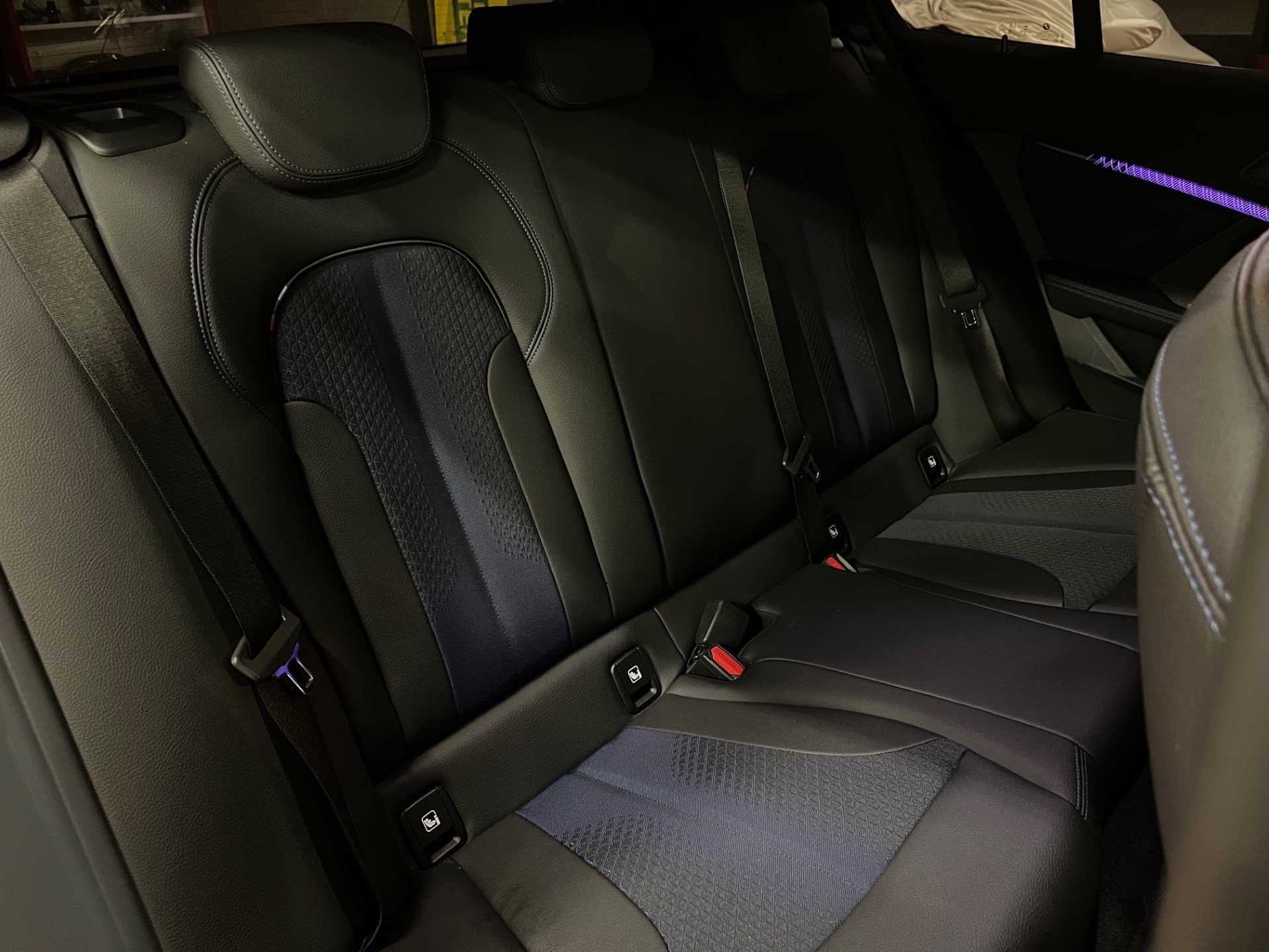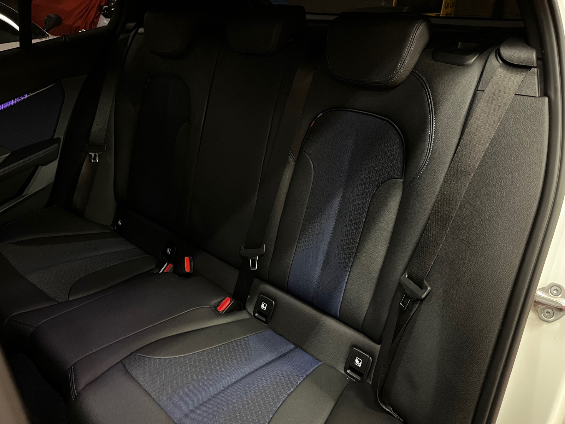 -Sièges électriques en cuir noir et tissus bleu, surpiqûres bleues M + chauffants